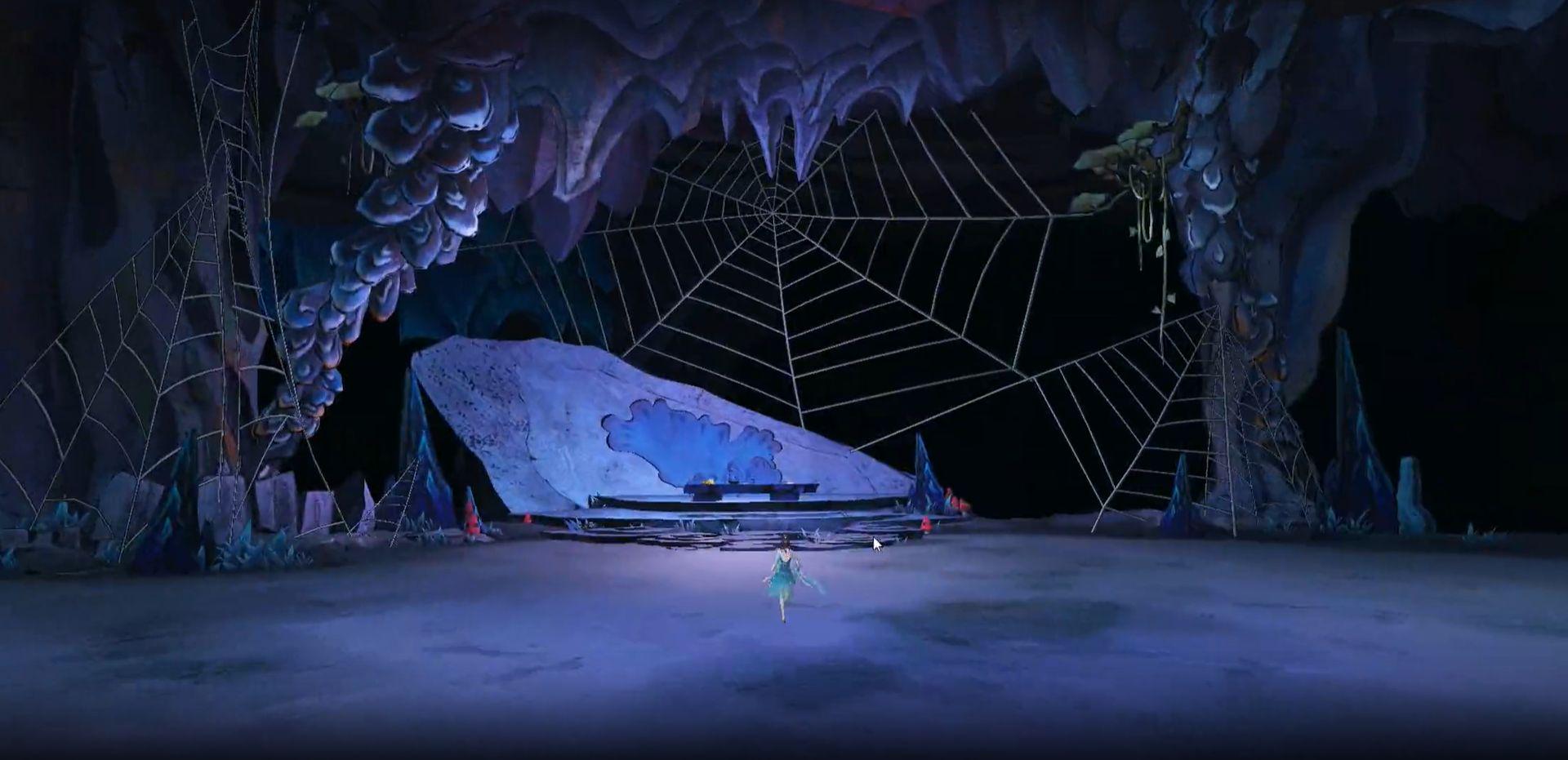 这次联动,在上美影老师的亲自指导下,《新倩女幽魂》用剪纸画风1:1复刻经典。妖精洞府怪石嶙峋,色彩阴冷又怪诞,神秘氛围直接拉满,真是隔着屏幕都能感受到洞府寒冷的气息,仿佛蛇精马上就要带着小妖们出来把我们抓走了!