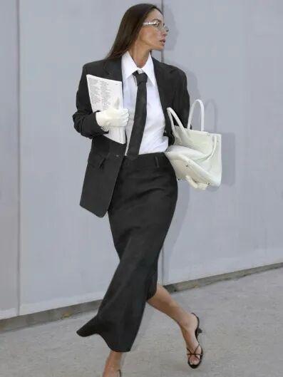 西装配开衩裙,优点多到数不清,不仅能够优化腿型线条,还能在视觉上有显高显瘦的效果,小个子女子也可以轻松驾驭。