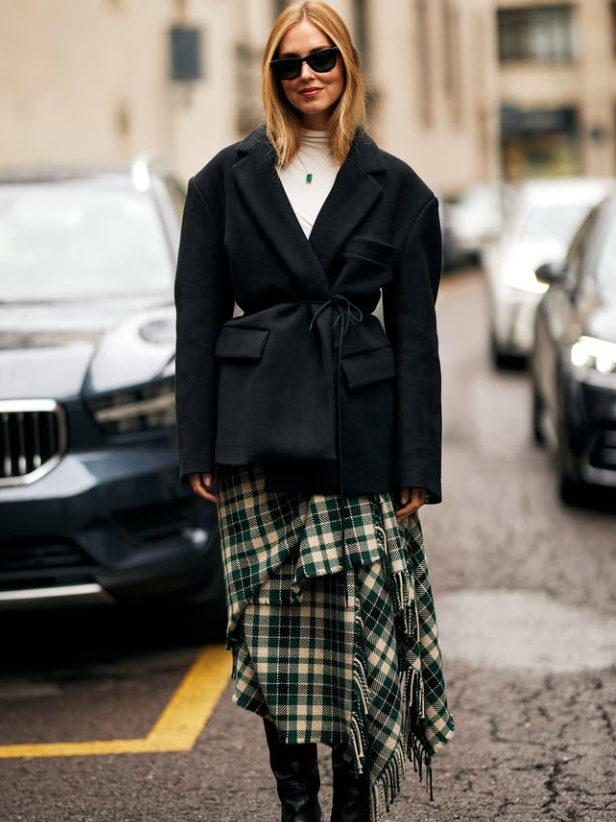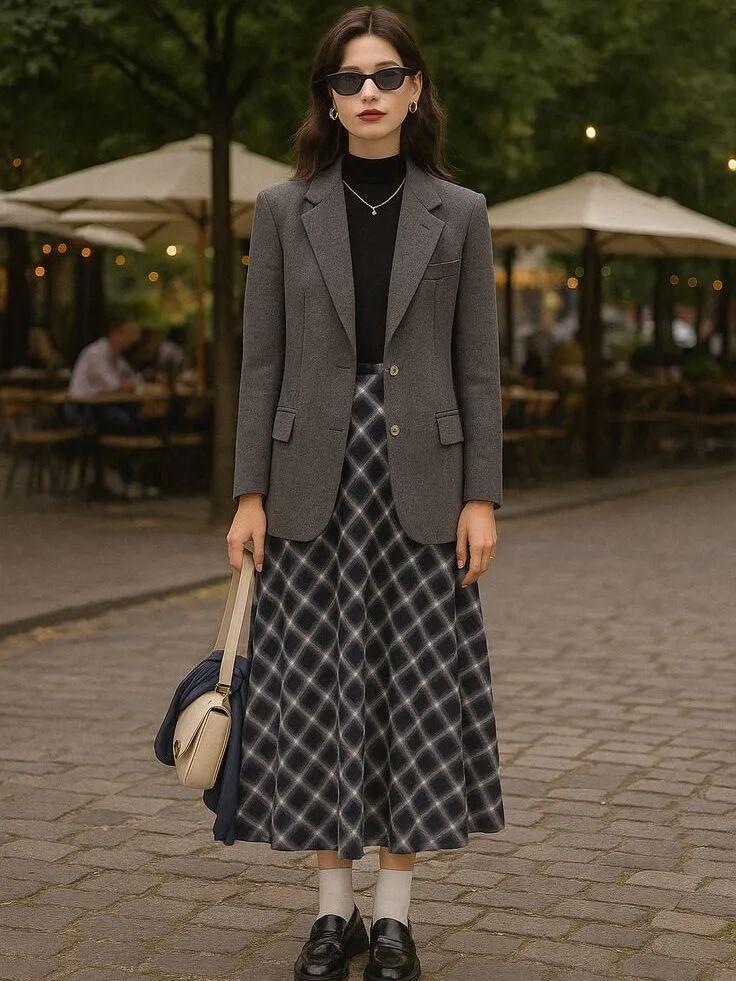 穿西装外套,我更推荐搭配深绿、深蓝、摩卡慕斯棕、红棕色调的格纹半裙,出彩百搭,打破萧瑟单调,还十分复古有腔调。