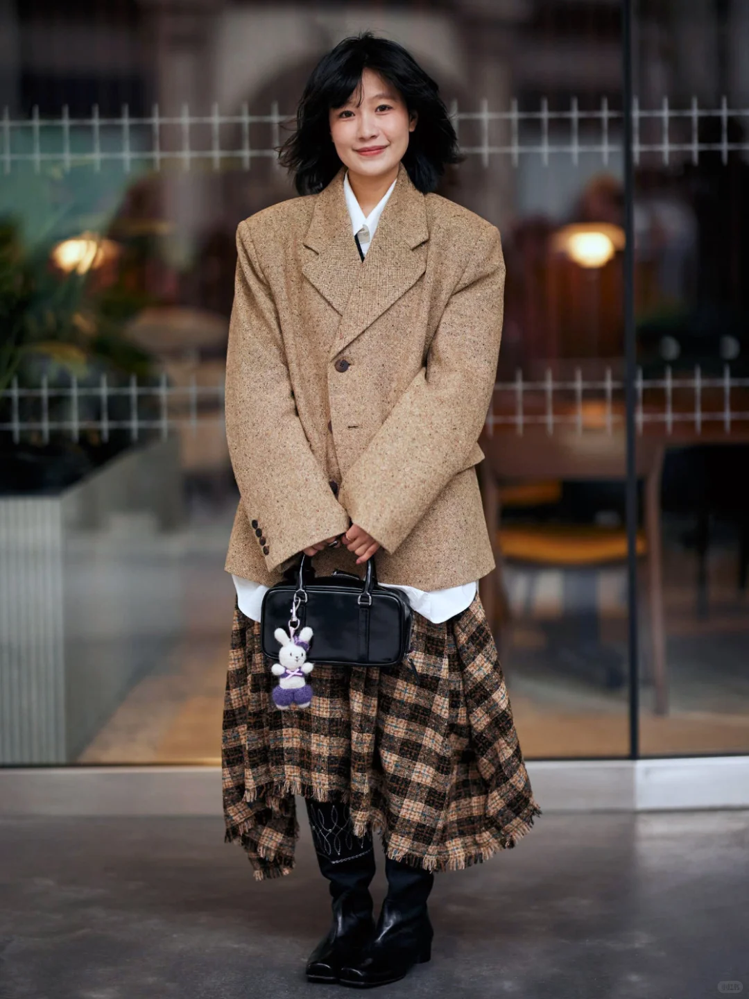 西装+格纹半裙