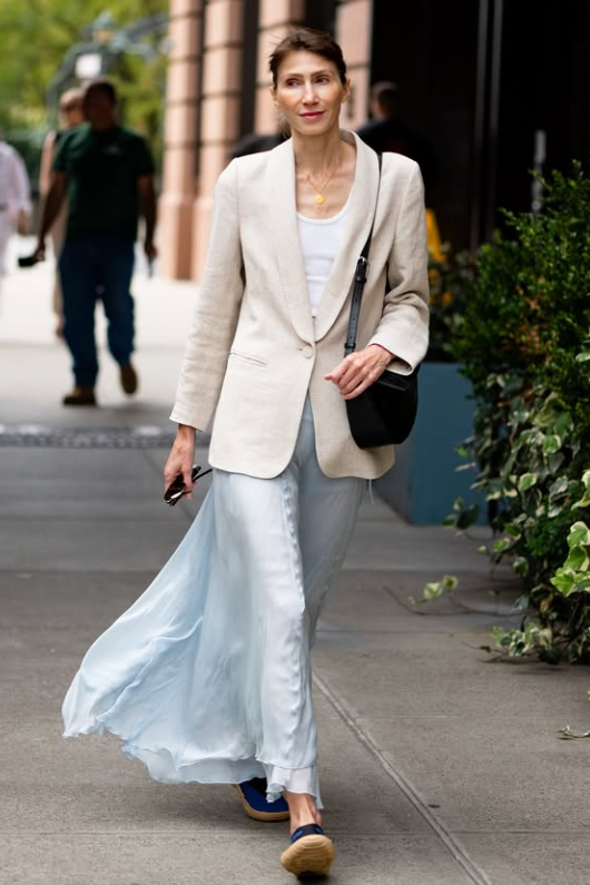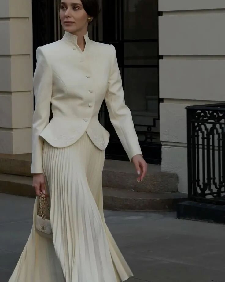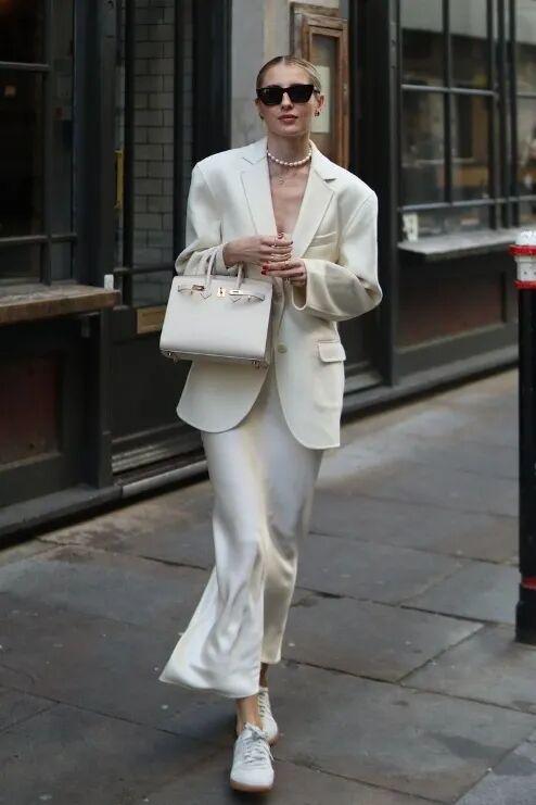 想要将这个组合穿得高贵而优雅,切忌太复杂的色彩,往往白色、米白色的西装外套,搭配各种不同色彩的缎面裙,视觉会更为协调有美感。