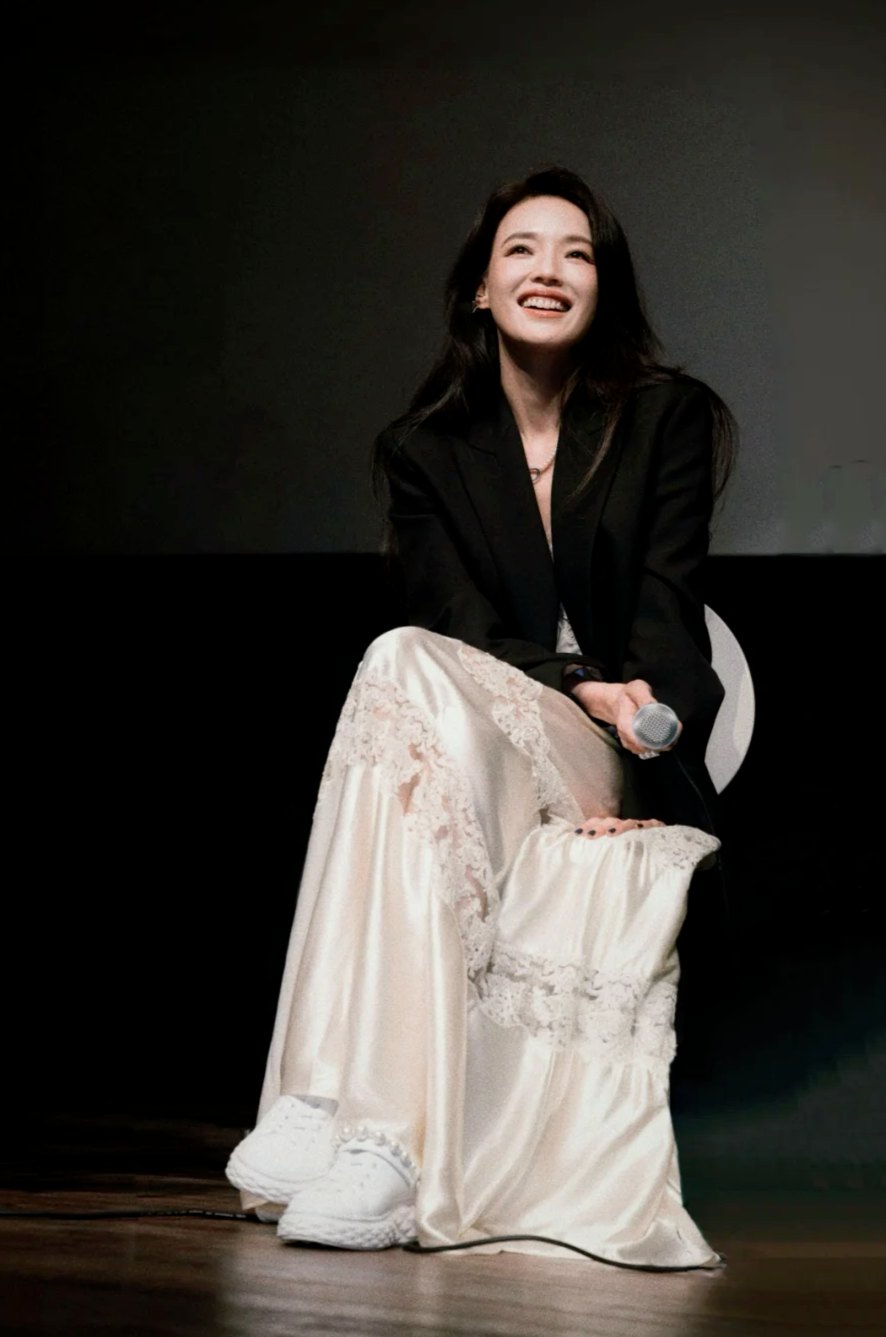 舒淇今年的一组look正是如此,黑色西装外套+长款的缎面蕾丝吊带裙+运动鞋,仿佛同时拥有力量与温柔,克制与浪漫......