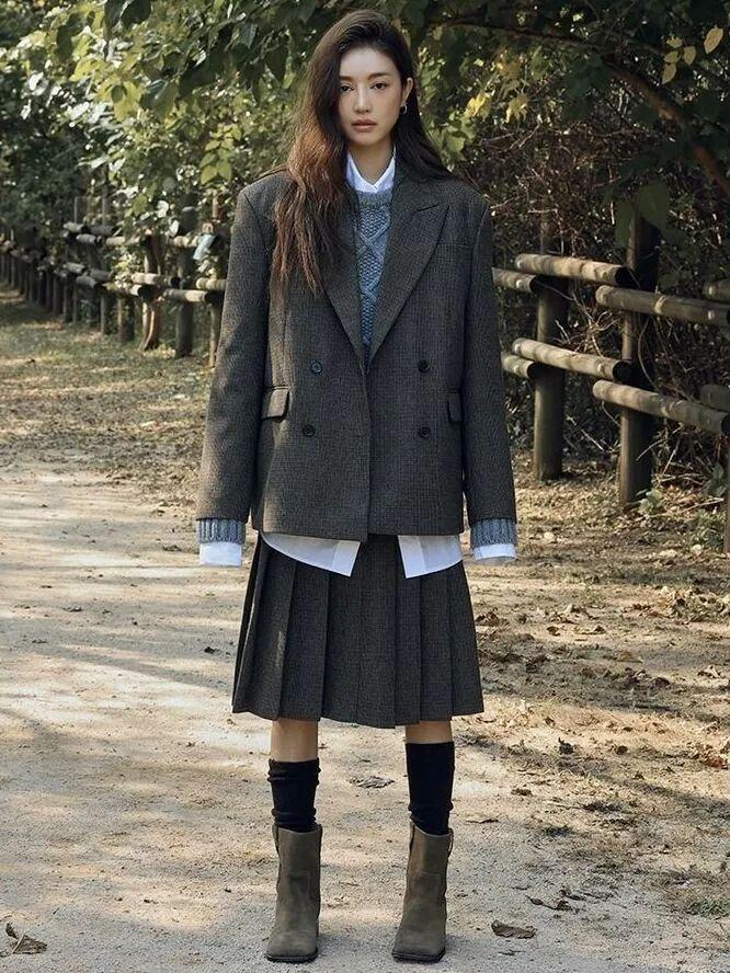 西装+百褶裙
