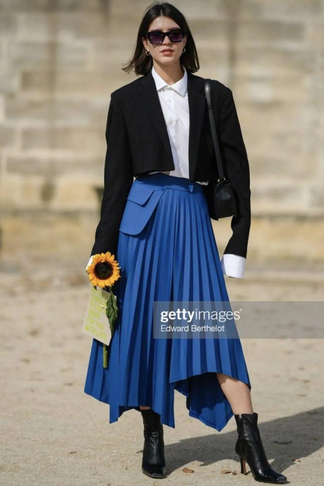硬朗线条的百褶裙,与西装的搭配,堪称是一组门当户对的CP,适合小个子,也能轻松穿出减龄的时髦感。