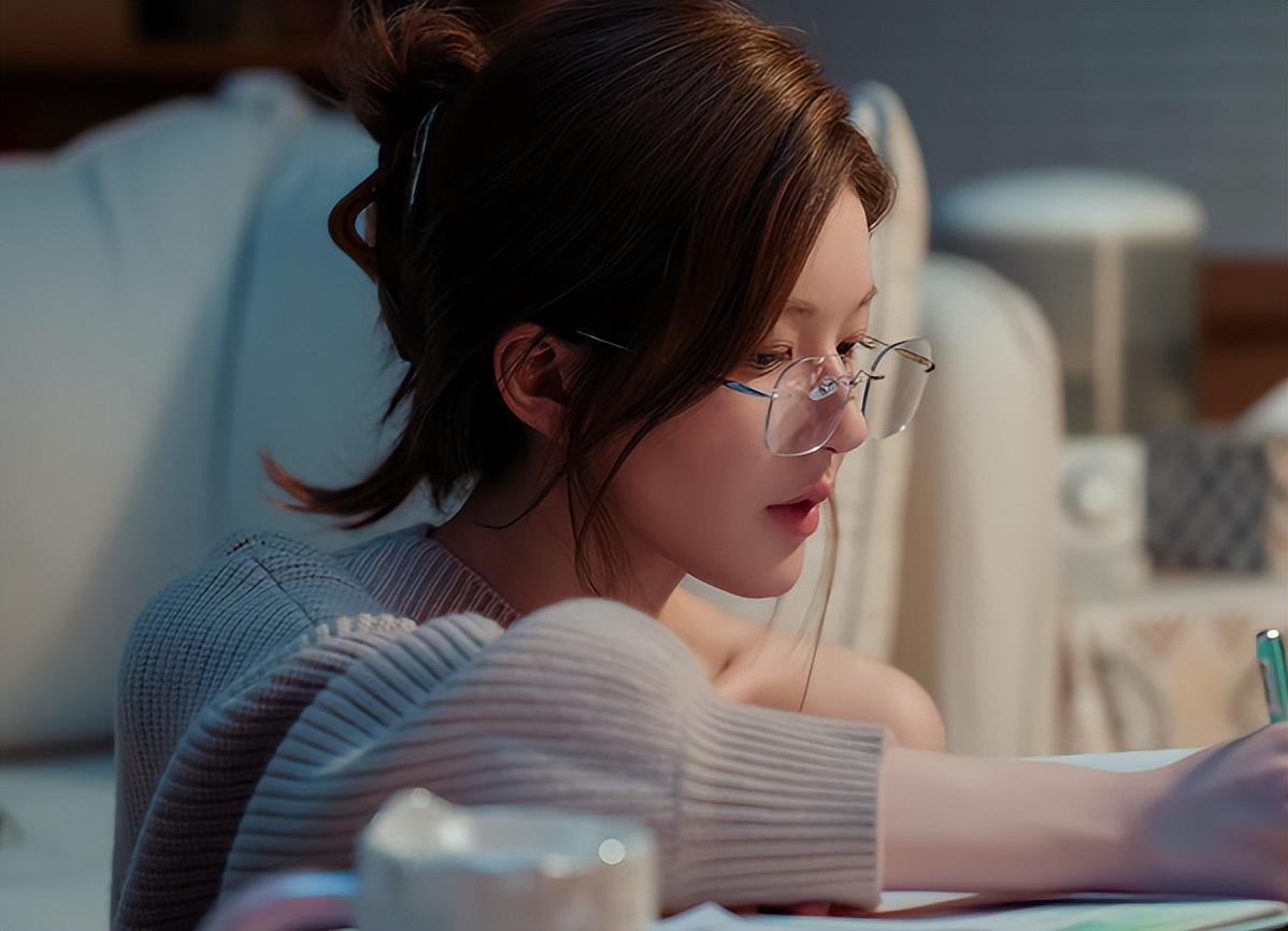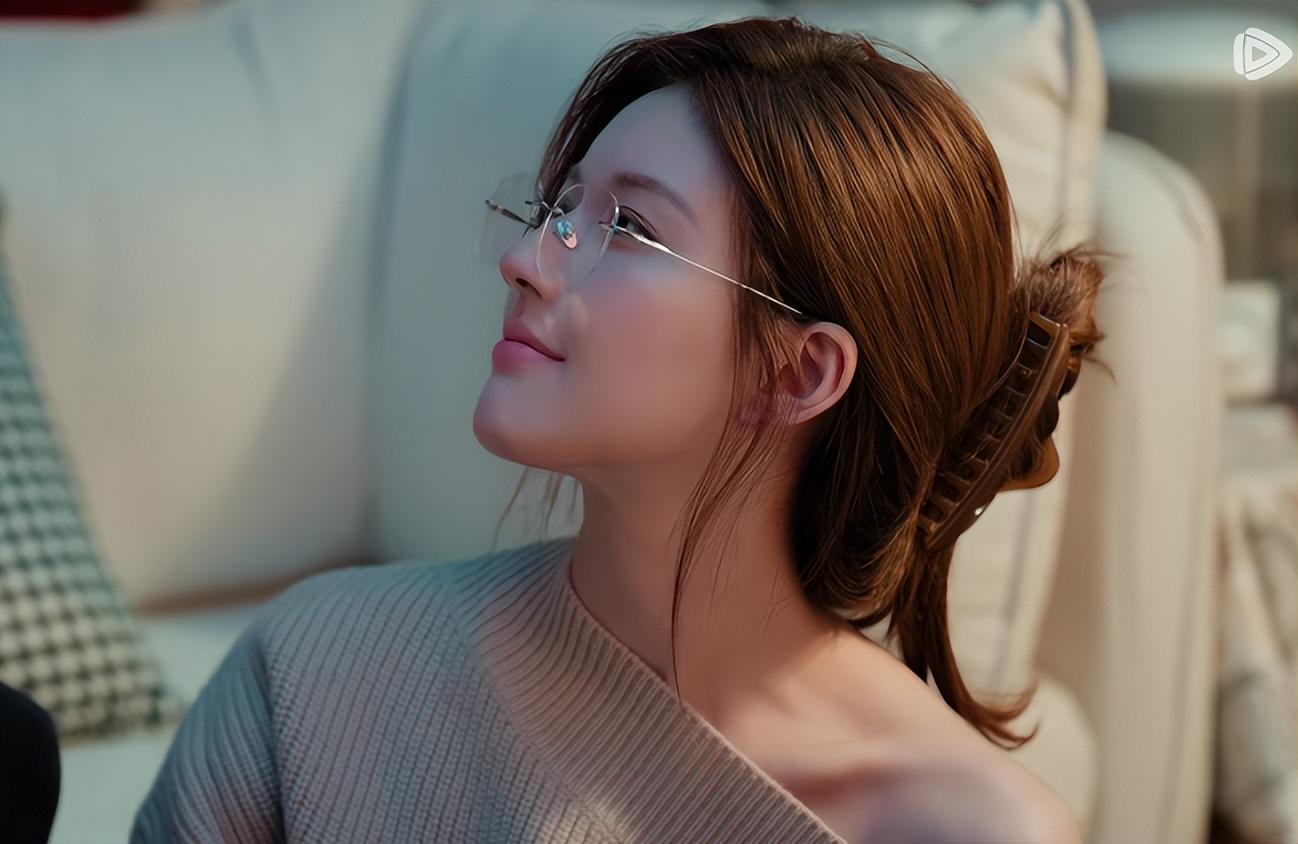 在家里忙工作,她戴着眼镜,穿着斜肩毛衣既简约又不失性感。