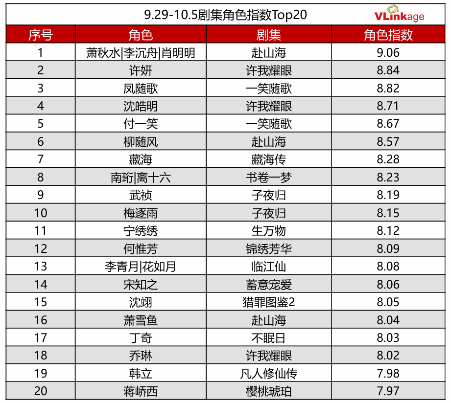 下图为上周剧集角色指数Top20,受众关注度最高的角色依然是《赴山海》男主萧秋水,自作品上线以来,该剧男主就有着居高不下的热度。