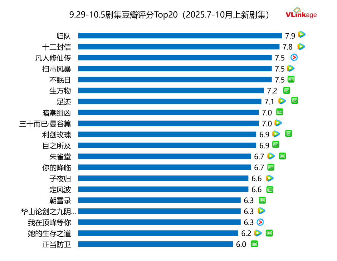 下图为7-10月剧集豆瓣评分Top20,《不眠日》豆瓣评分7.5分进入榜单。今年下半年,还没有作品口碑达到优秀线。