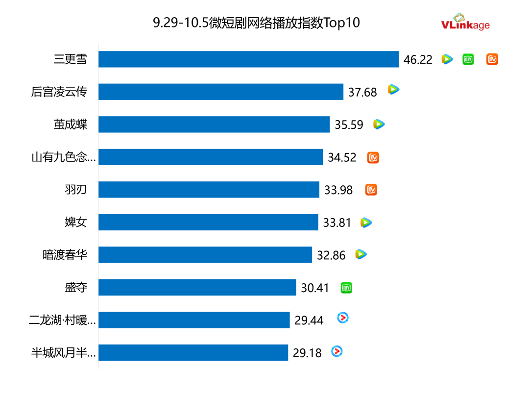 下图为上周微短剧网播指数Top10,热度表现最亮眼的为《三更雪》,该剧也是上周唯一一部网播指数40+的微短剧。