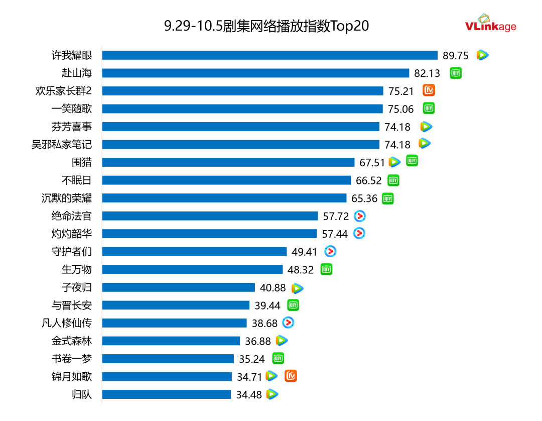 下图为上周剧集网播指数Top20,热度最高的剧集为开播第二周的《许我耀眼》,网播指数直逼90,这部都市情感剧戏剧冲突强烈,主角人设带感,是今年现实题材领域的黑马之作。