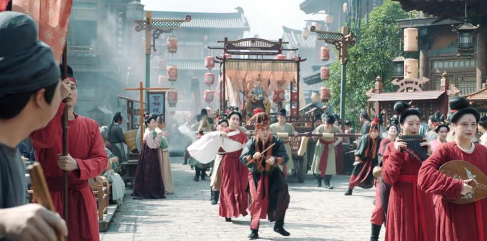 剧组以《清明上河图》为蓝本复原的永安东市,青石板路的纹路、酒肆幌子的材质、胡商摊位的陈设,都力求还原中晚唐市井生态。