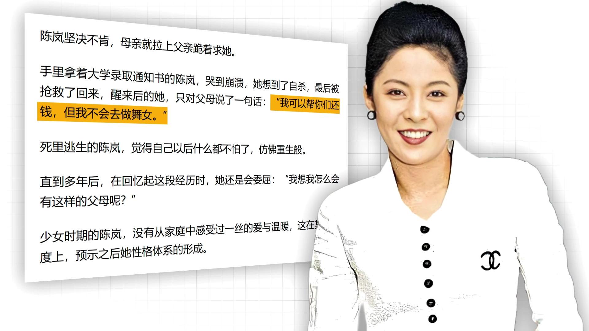 陈岚小时候的日子过得很悲惨,母亲滥赌,父亲重男轻女,到陈岚23岁时,她才知道父亲并非自己的亲生父亲。
