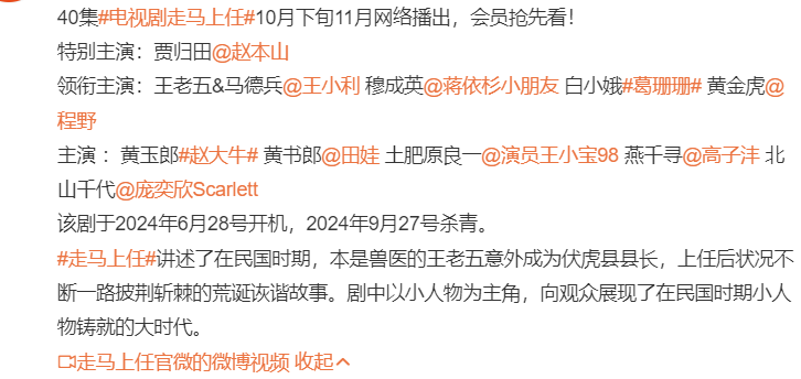 电视剧《走马上任》已经进入播出倒计时,有资深电视剧博主透露,播出时间就在10月下旬。