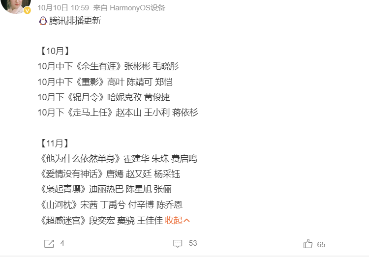按照某博主公布的鹅厂排片计划,10月份应该会有四部作品与观众见面,先后顺序分别是《余生有涯》《重影》《锦月令》和《走马上任》。