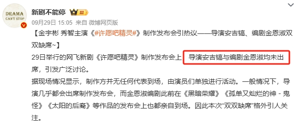 而且,不久前的新剧发布会上,导演安吉镐与编剧金恩淑都没有出席。