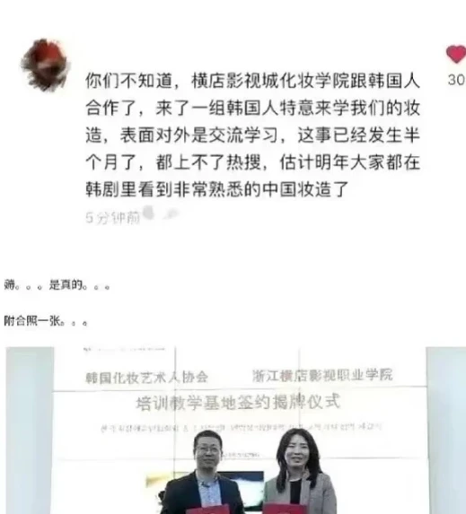 之后的事情想象大家都清楚了,官媒接连下场点名批评韩剧《暴风圈》和《暴君的主厨》夹带私货,一个台词辱华,一个篡改历史,这就让允许韩剧来取景的横店一时间成为了众矢之的,甚至,横店还提前让韩国人来横店学院学习我们“中式妆造”,这就更加没得洗了,估计,之后韩国的古装剧基本就和我们的国产剧没有任何区别了,都是横店的功劳。