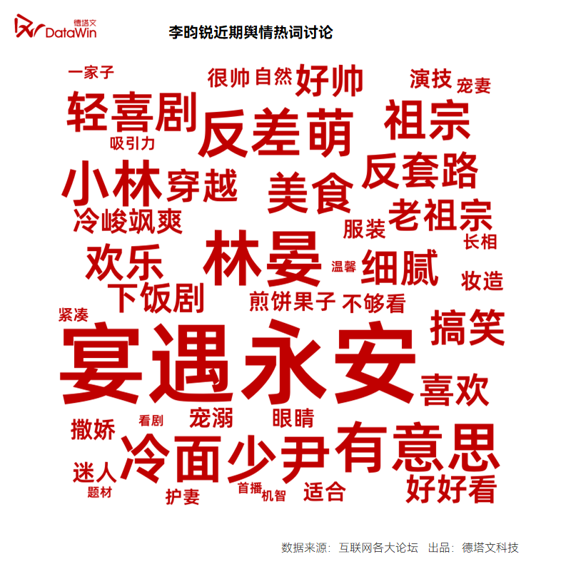从舆情反馈来看,在《宴遇永安》播出期间,李昀锐的近期舆情热词既有“好帅”“迷人”“宠妻”“反差萌”等角色形象词,一定程度上表明李昀锐通过林晏一角,在受众基本盘的基础上成功地强化了其吸引女性观众的特质;也有“喜欢”“好好看”“下饭剧”等口碑词,表明其在路人群体中引发了积极讨论,路人缘与好感度均有所上升,从而实现了有效播剧。