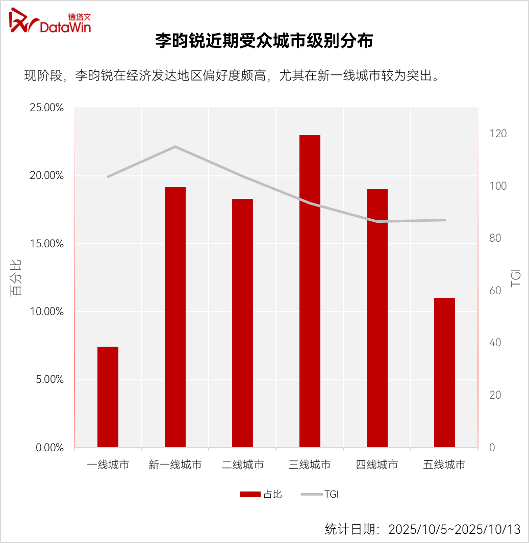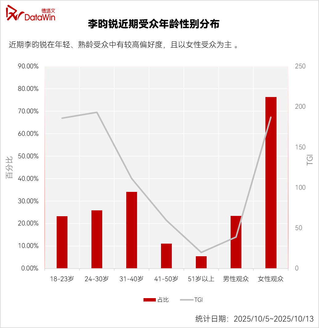 据德塔文数据监测的近期受众分布显示,其在 18-40 岁女性观众中的关注度与偏好度相对突出,这一分布特点与其在《九重紫》《星汉灿烂》等前期作品中积累的观众基础相契合。此外,在受众地域分布上,其在一线及新一线城市的观众占比具有优势,反映出在消费能力较强的观众群体中,其认可度相对较高。