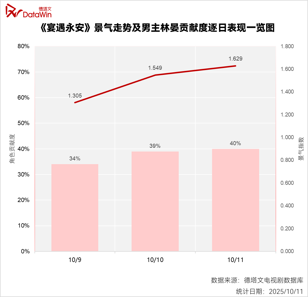 《宴遇永安》国庆节后开播,首播即获得五个广告投放,其站内热度、德塔文景气指数及全网曝光量均呈现快速攀升态势,初期市场表现较为突出。伴随剧集热度不断飞涨的,还有男主林晏的角色贡献度。德塔文数据表明,该剧播出前三日的景气指数增长,与男主林晏角色贡献度呈正相关,直观体现了李昀锐作为主演对剧集热度的拉动效应以及口碑发酵的引流作用。