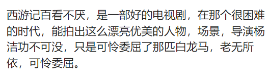 还有人写道:“《西游记》百看不厌,是一部好的电视剧,在那个很困难的时代,能拍出这么漂亮优美的人物、场景,导演杨洁功不可没,只是可怜委屈了那匹白龙马,老无所依,可怜。”
