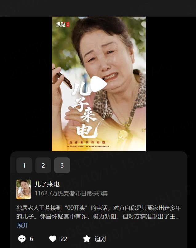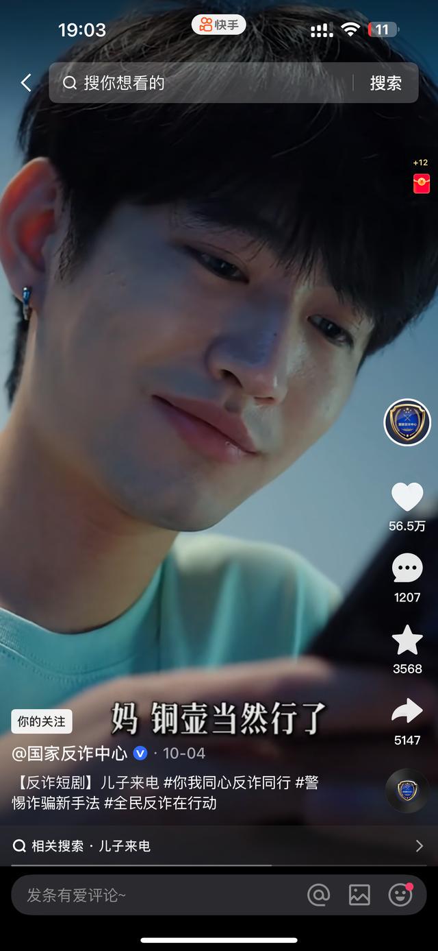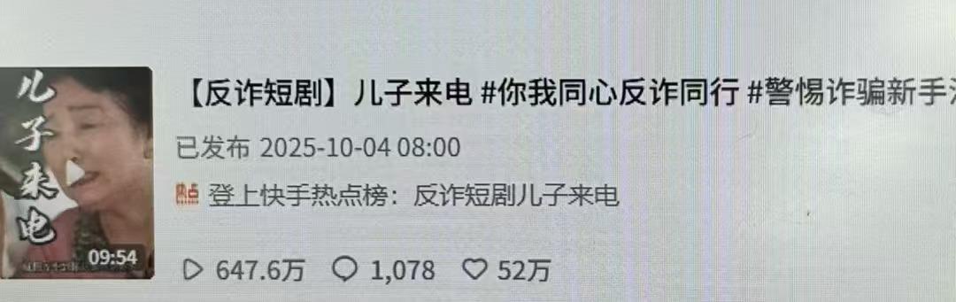 纵览客户端讯(解保童)“拍得真好看,关爱老人。”“看哭了。”近日,反诈系列微短剧《儿子来电》登上快手全国热榜,获得超650万次播放,超55万次点赞(截至10月15日),不少网友纷纷留言好评。