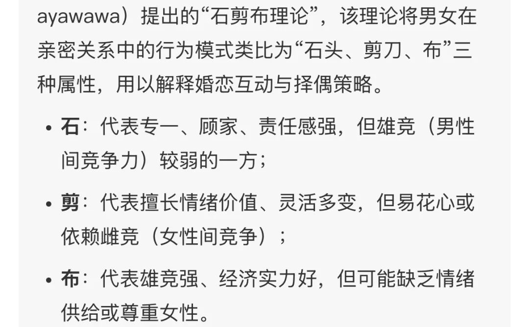“布”代表着雄竞,也就是对获取资源、事业、社会地位的追求;“剪”雌竞力很强,男性身上则表现为外貌俊朗,具有个人魅力,有艺术家特质,不专一但很能够提供情绪价值;“石”的核心特点是注重“亲投”(亲代投资),会为配偶和后代注入自己的大部分时间、热情、和资源,石很忠诚,也就是我们常说的顾家、稳定,宜室宜家。