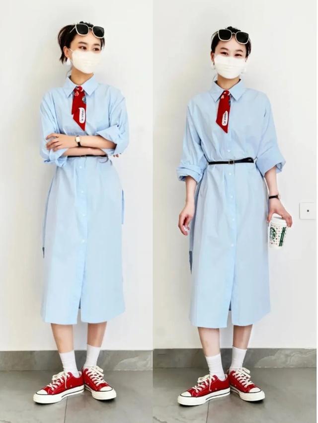 家里有腰带的要利用上,塑造高腰线凹出比例,红蓝配色,用红色领带和帆布鞋增加学院风,整套非常适合大学生!