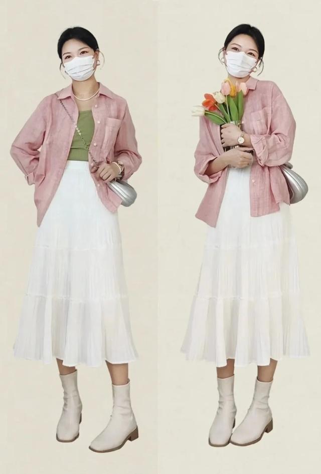 喜欢小清新建议尝试一下春日郁金香穿搭,粉+绿的色彩组合充满了春天的元气感,白色半裙可以中和掉甜腻感,让整体搭配更清爽,斜挎小包拉出高腰线,不论哪个角度看都是显高又显瘦。