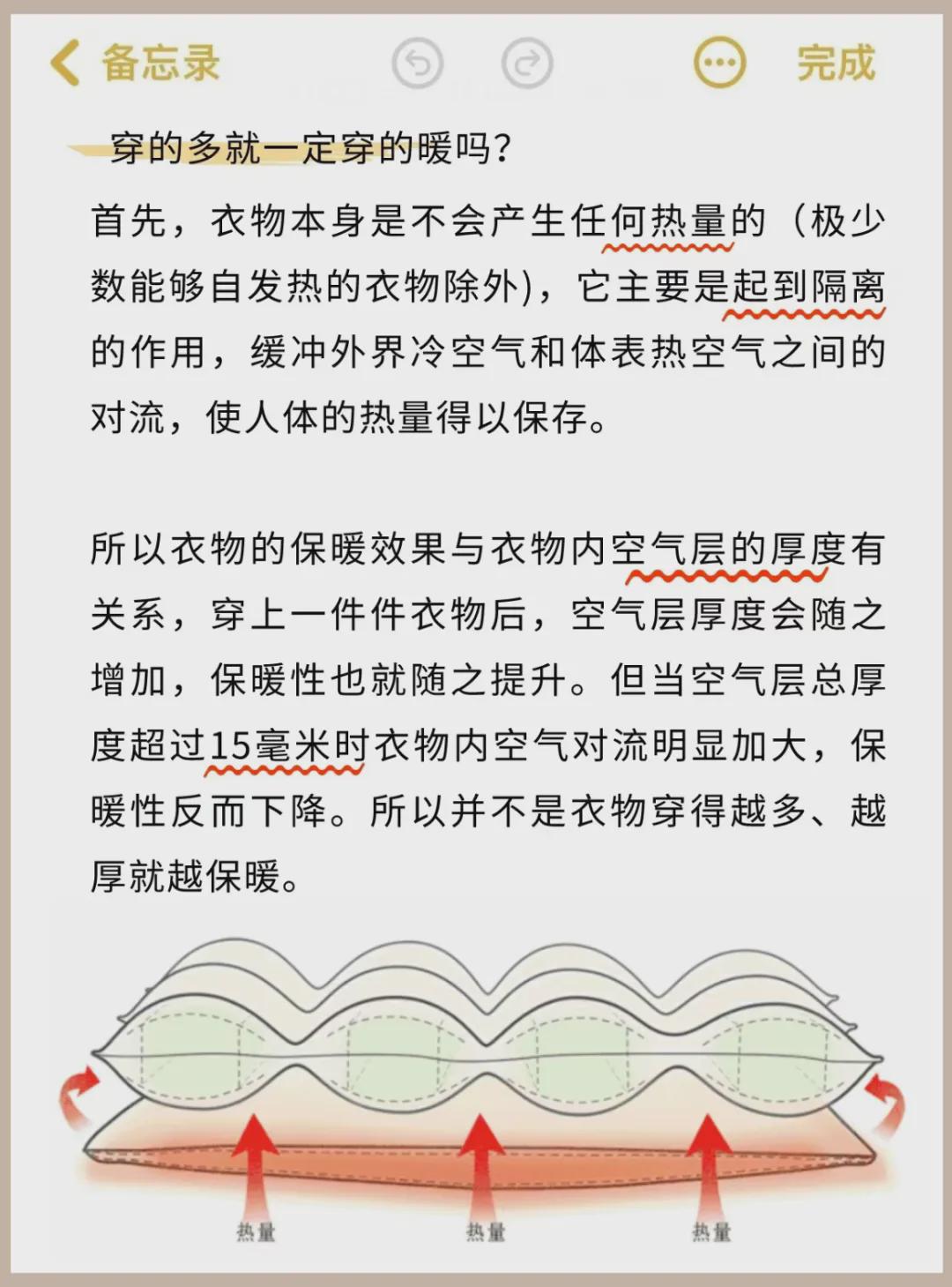 简单来说就是穿多了,衣服之间用来“储存热量的空气层”被挤压没了,所以穿得越多反而更冷!