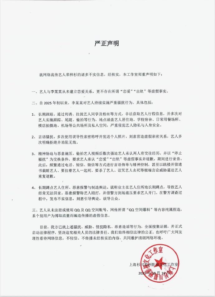 荣梓杉发布了声明,在声明中他否认和李禹熹有恋爱关系,否认出轨,但他没有对打人一事做出回应。