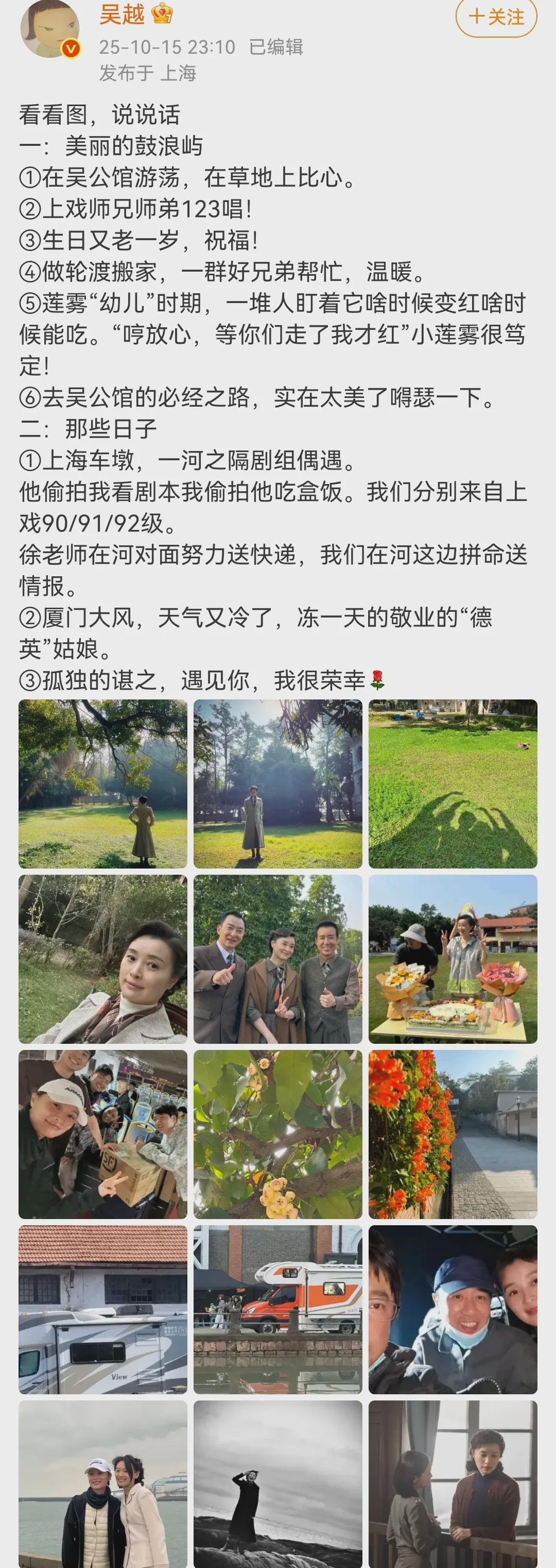 吴越在15日发了一组照片,她说:“孤独的谌之,遇见你,我很荣幸。”