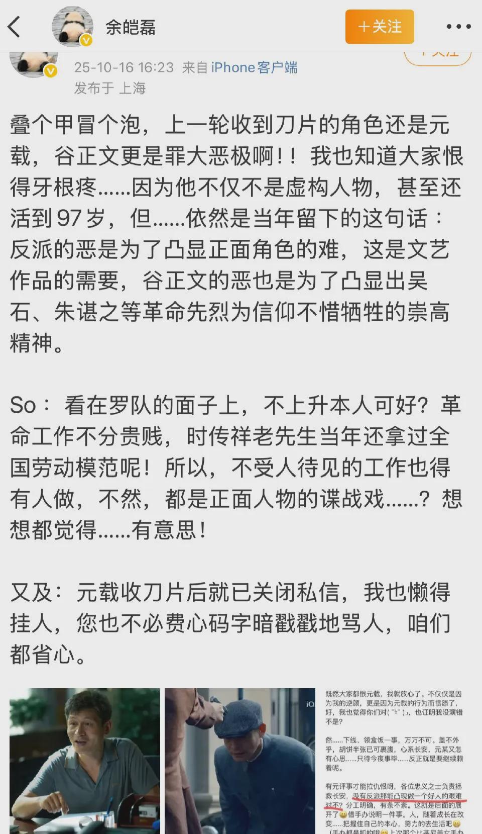 饰演谷正文的演员余皑磊,也知道观众对这个角色、这个历史人物恨得牙根疼,所以他赶忙在微博发文“求放过”,希望大家不要将对角色的仇恨,上升到演员本人。
