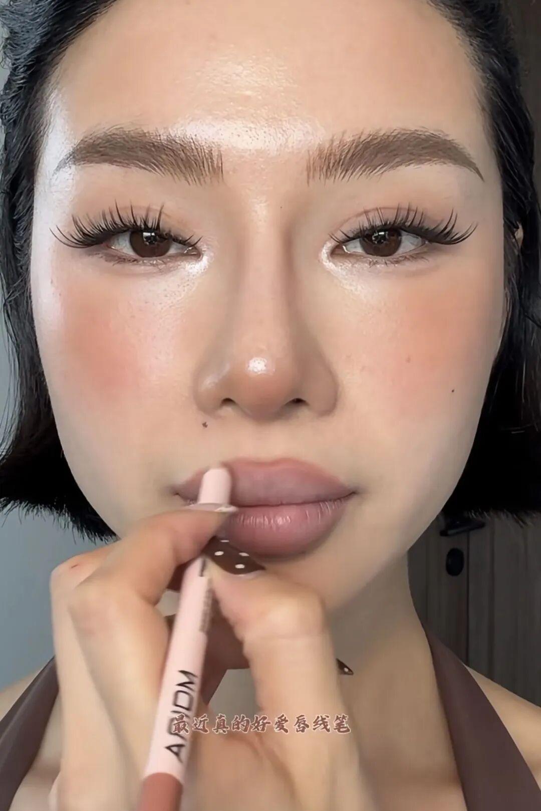 勾勒唇型:选择比自己唇色深半度的唇线笔,从人中弧线和唇角开始,轻轻描出自然轮廓。如果想营造“丰唇感”,上唇中央可以稍微外扩 1~2mm。