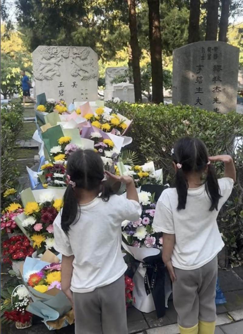 吴石墓前,小朋友在敬礼。央视新闻