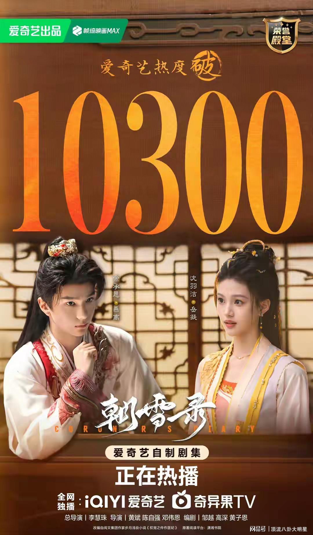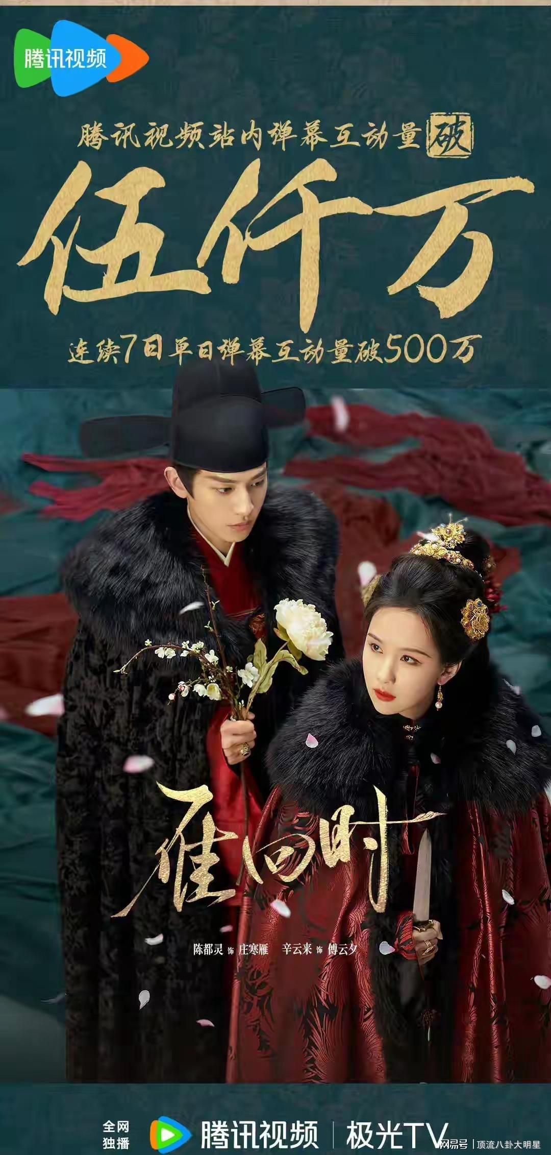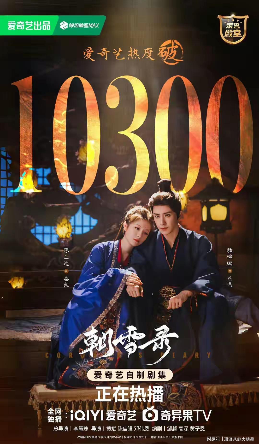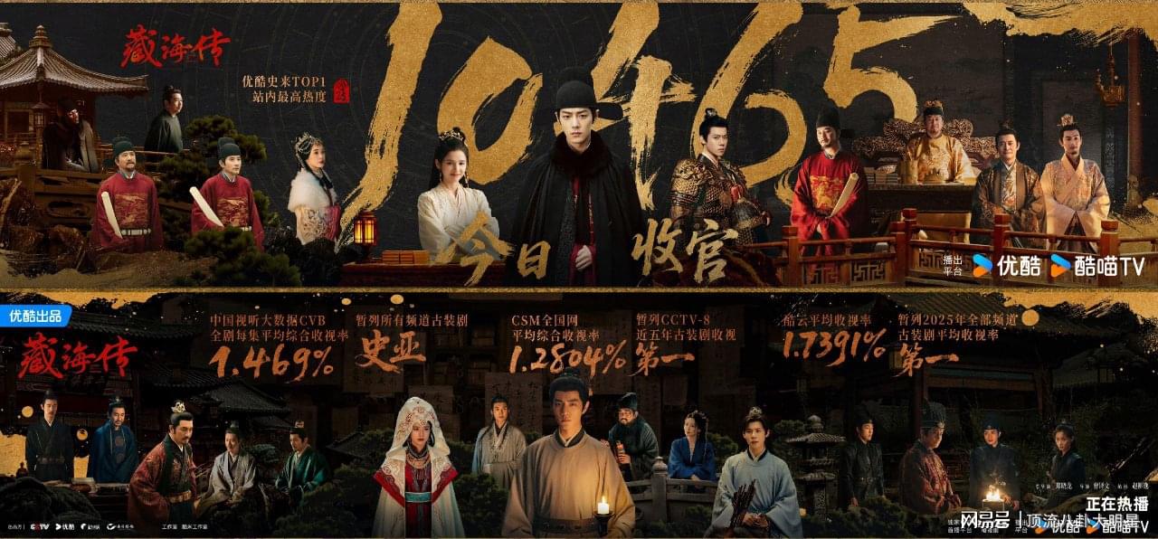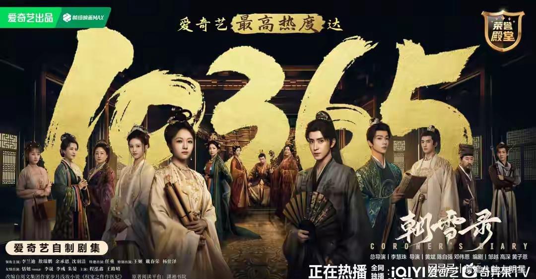 在爱奇艺站内热度峰值最高达10465,登顶平台历史热度冠军,在央视八套平均收视率1.7391%,近五年央八古装剧收视第一,抖音主话题播放量150亿+,云合市占率峰值40.1%,创年度最高纪录。长尾效应灯塔累计播放量30.34亿,集均播放量6645.7万,