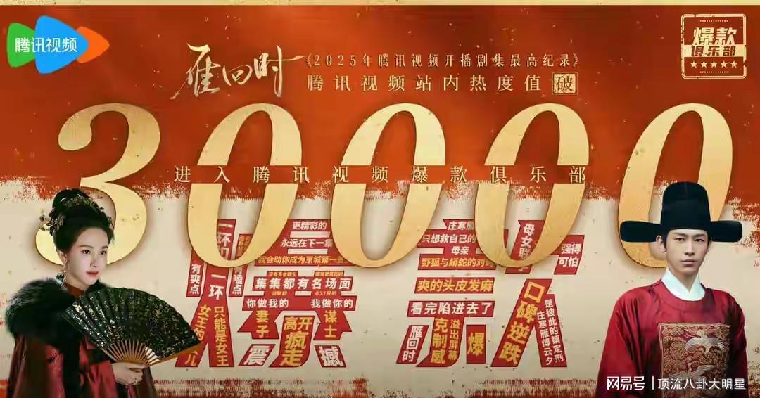 腾讯站内热度峰值26670,爱奇艺首日热度7657,全网有效播放量破16亿,集均超4000万,创2025年Q3武侠剧最高记录。