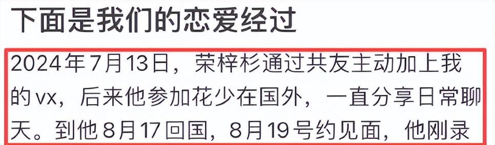 据她自述,荣梓杉与她的开始,是前者主动找共同好友联系上的。