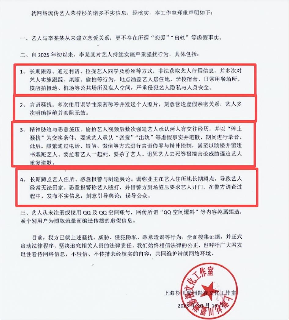 在这份声明中,荣梓杉的工作室表示李禹熹的说法并非事实。且再次强调,荣梓杉并没有与李禹熹建立恋爱关系。不仅如此,从2025年年初开始,李禹熹就对荣梓杉实施了持续骚扰,并长期跟踪、精神胁迫。
