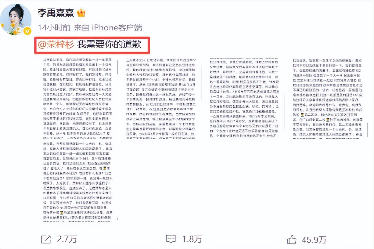 并且,她艾特了荣梓杉,表示,“我需要你的道歉”。