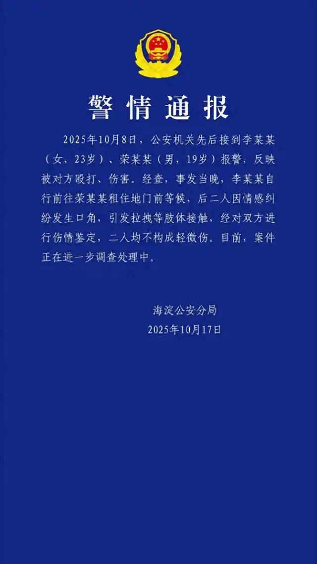 10月17日,北京市海淀公安分局也发布了关于此事的通报:二人经对伤情鉴定后,均不构成轻微伤。目前,案件正在进一步调查处理中。