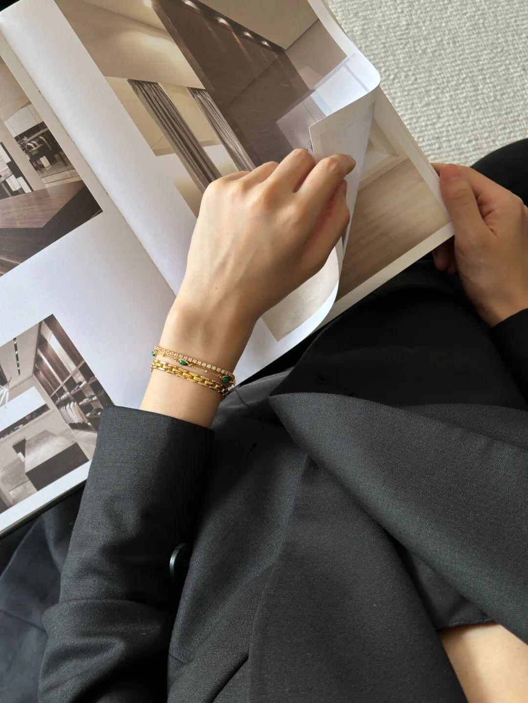 时光链节手链+小方糖闪钻手链+熔岩孔雀石手链,单拎出来就已经美得让人挪不开眼;叠戴在一起繁中有简,更让人心动了~ ▼