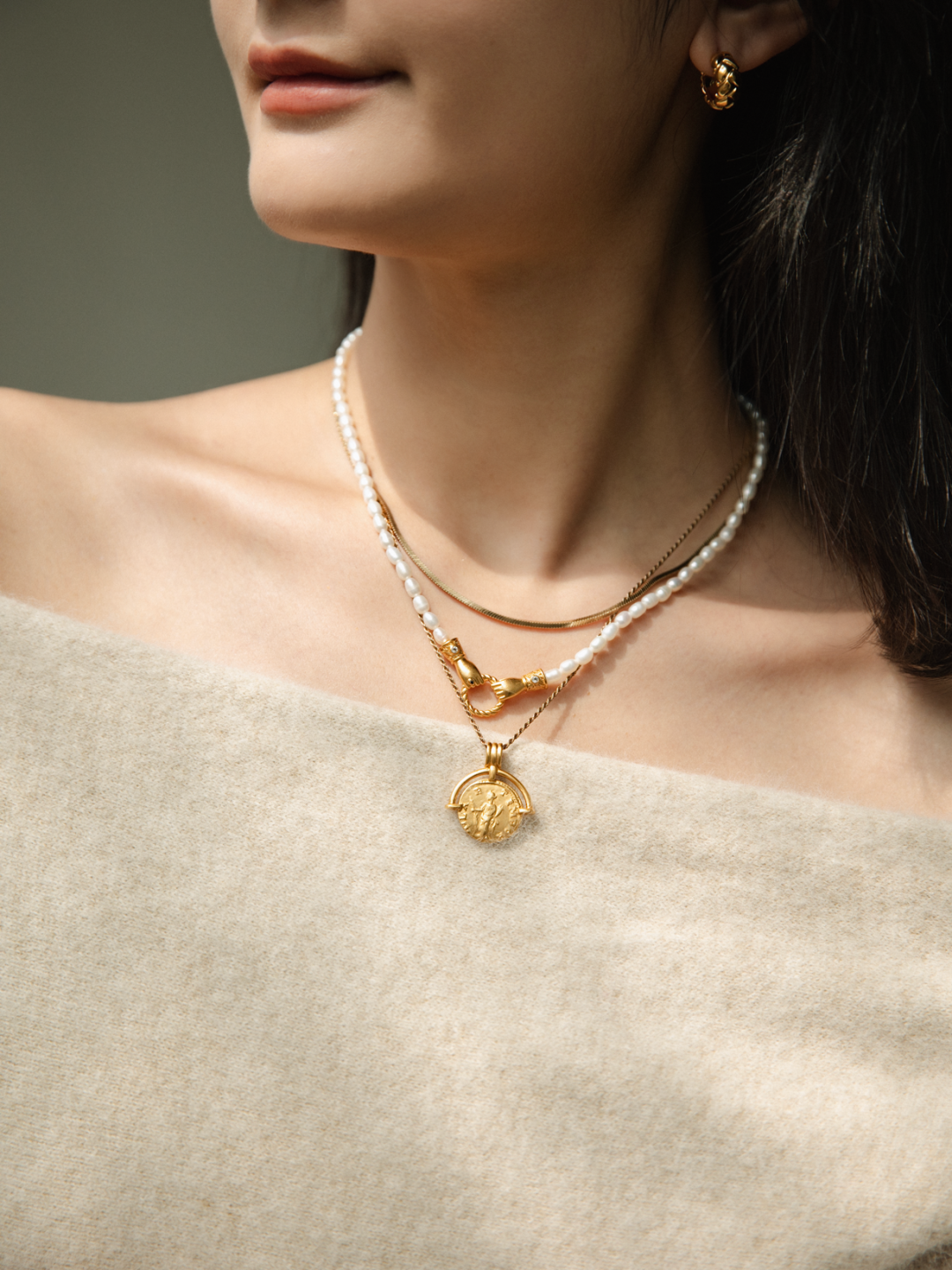 珍珠项链属于锁骨链,想要层次更丰富的,还可以叠戴一条他家经典的硬币项链