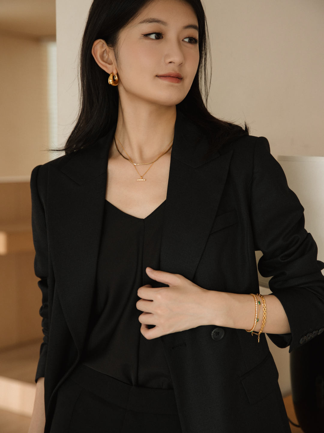 这一套首饰给我的感觉就像“万金油”,什么场合都能配,搭毛衣就是很气质知性,换成西装又有一种利落大气的感觉。 ▼