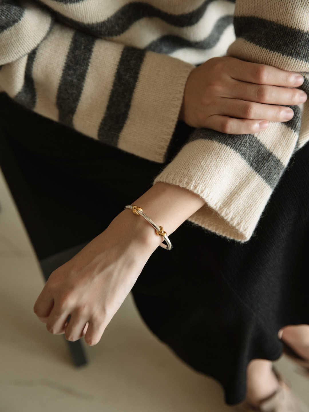 同系列的金银手镯也好美,它不像普通的素镯,而是在银色圆环上加了两个金色纽结元素,低调又清冷,设计中性,还很适合做情侣款。