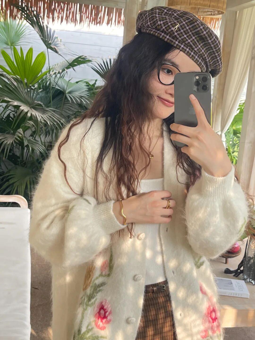 针织开衫+格子裙+贝雷帽,再用雪熔花项链和手镯点缀,太加分了!在复古的调调上多了几分个性。 ▼