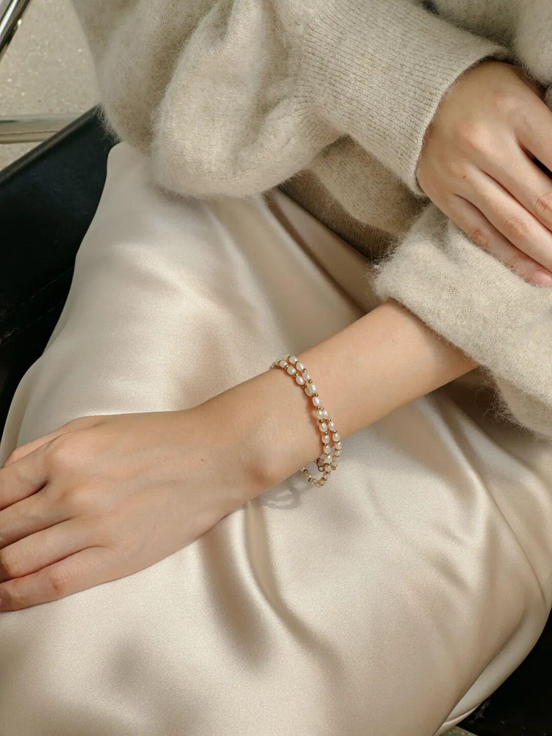 但是我不说你应该猜不到,它居然是一条项链吧?其实也是 Missoma家的米粒珍珠项链,不过中间多了一些小金珠点缀。绕两圈刚好变成多层手链,一条顶两条用!▼