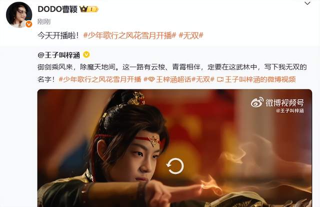 与此同时,主持人曹颖还转发了一则时长达00:19秒的短视频,该视频系电视连续剧《少年歌行之风花雪月》先导片,是由其爱子王梓涵主演的,下面就让我们一起来看看曹颖长子王梓涵此次的这个大动作都有哪些值得关注的亮点之处: