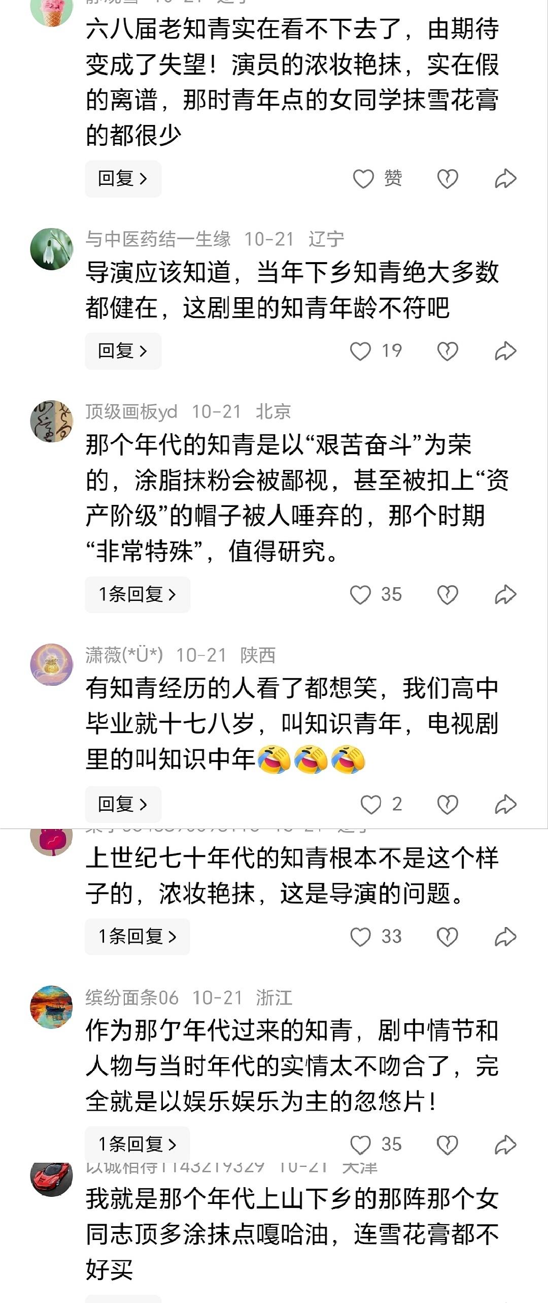 很多观众家里或亲朋好友里都有知青,经常听到他们谈到当年,亦会欣赏他们当时的照片,生活又苦又累却洋溢着朝气和青春,脸上带笑眼里有光,没有惨白的脸和假眉假眼。