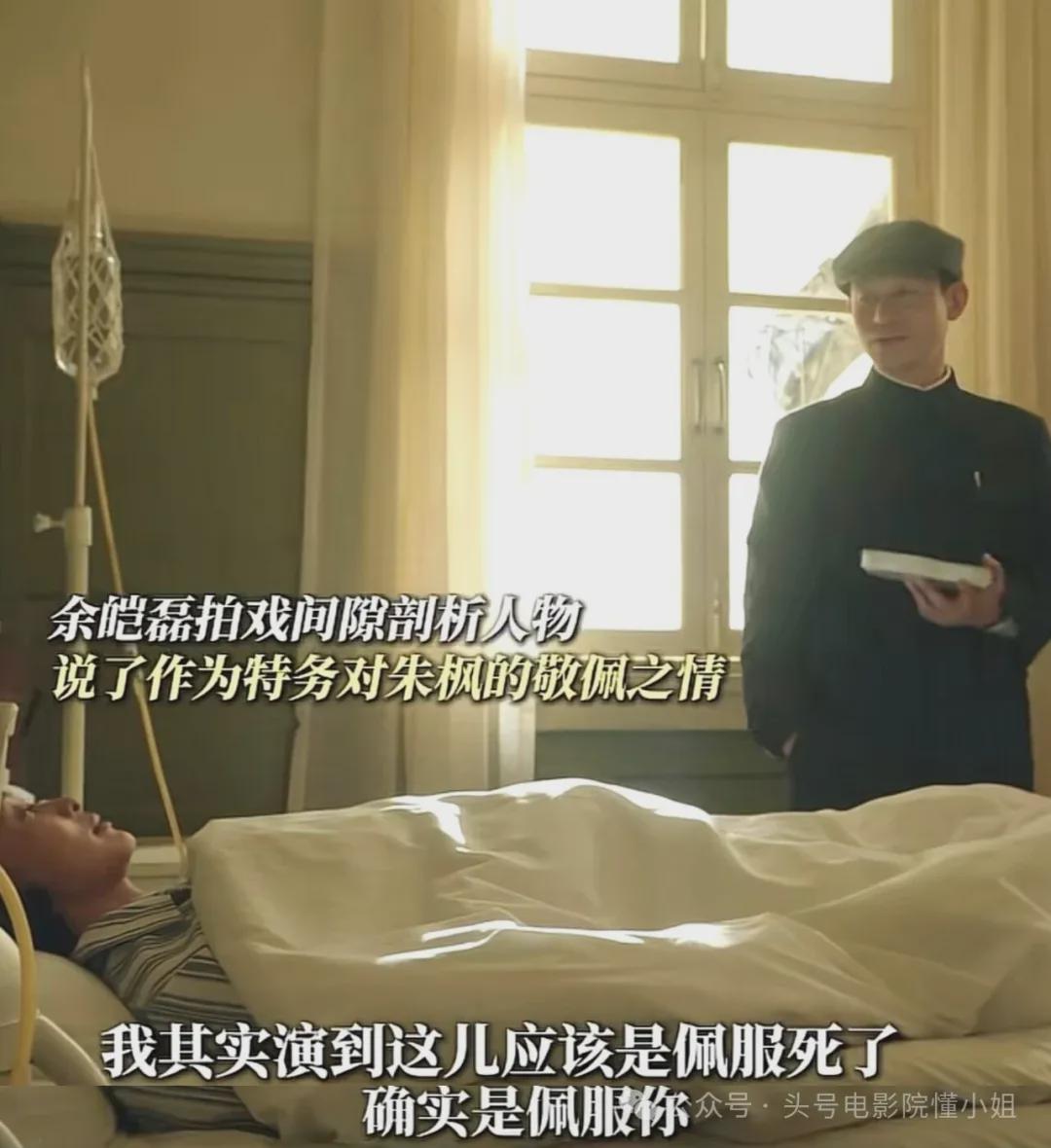 在一场拍摄朱枫吞金之后被抢救的戏时,饰演谷正文的余皑磊和躺在床上扮演朱枫的吴越交流,余皑磊表达着他的角色作为特务,对朱枫的敬佩之情,“我其实演到这儿,应该是佩服死了,确实佩服你。”