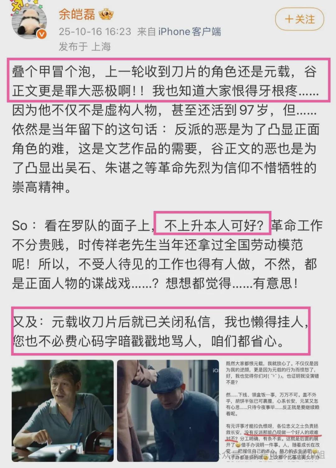扮演“谷正文”的余皑磊也“不躲”了,干脆直接在社交账号发文,请求大家对角色“不上升本人可好”?
