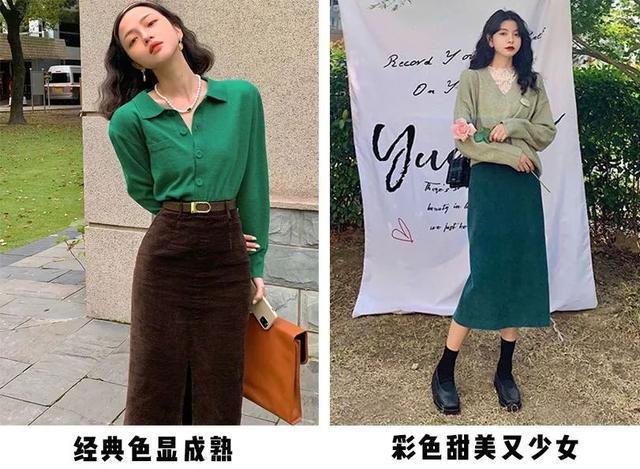 灯芯绒半裙+同色系毛衣是最佳CP,材质接近,软糯糯的,轻轻松松穿出少女滤镜感。